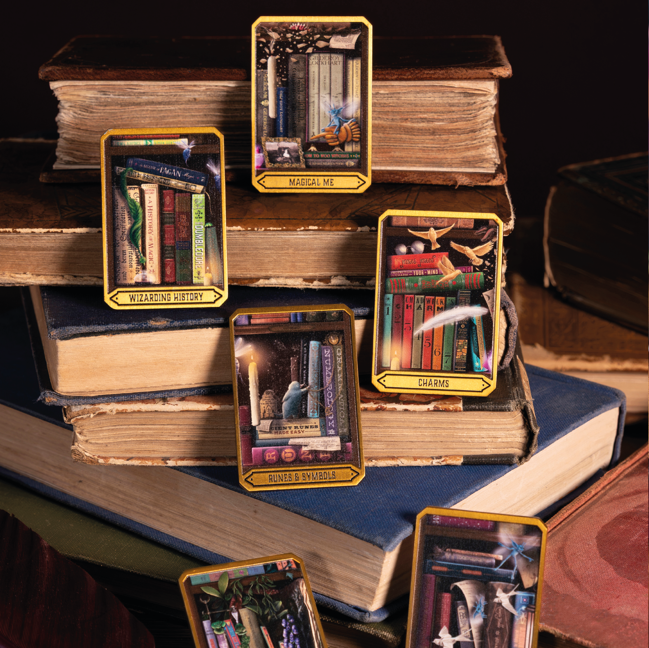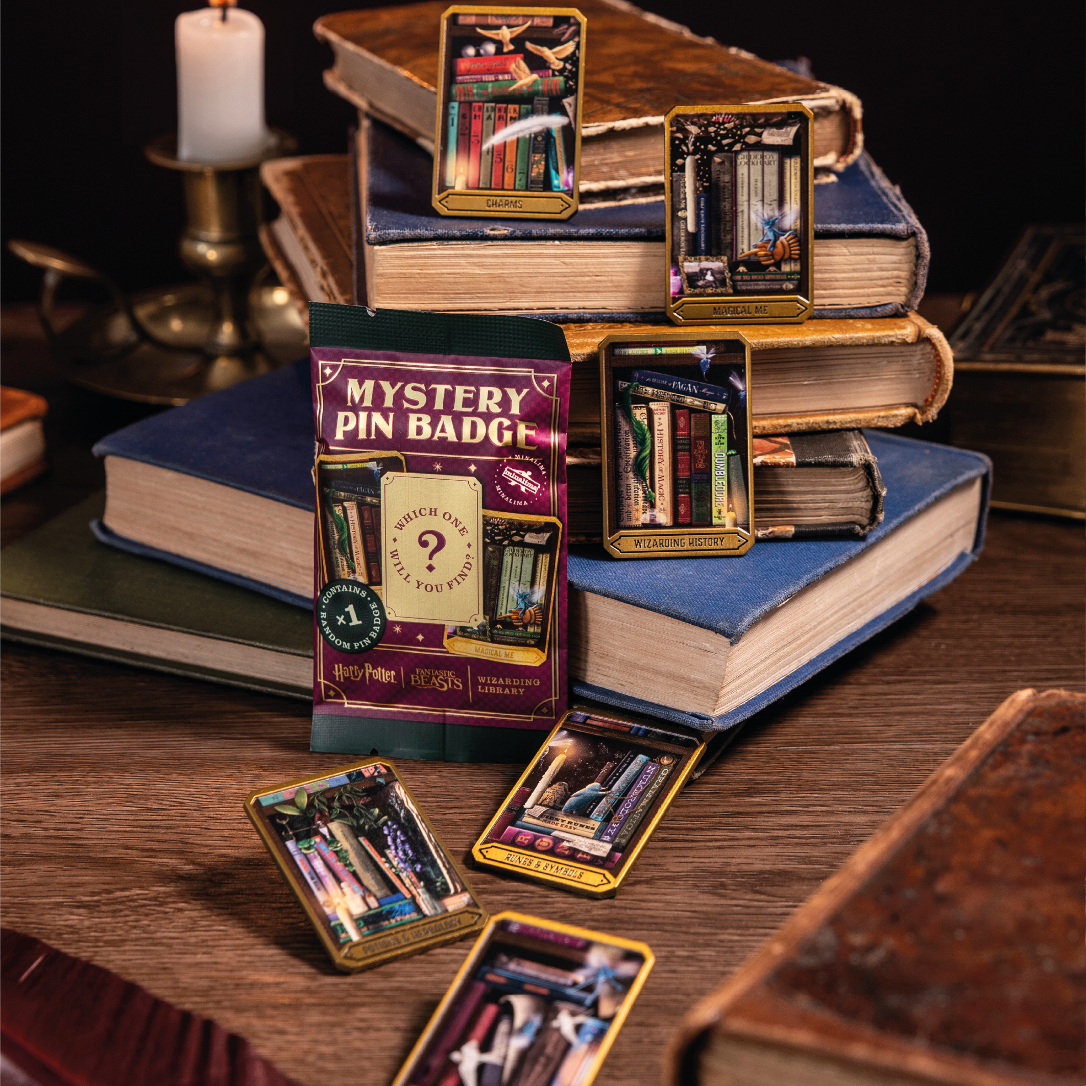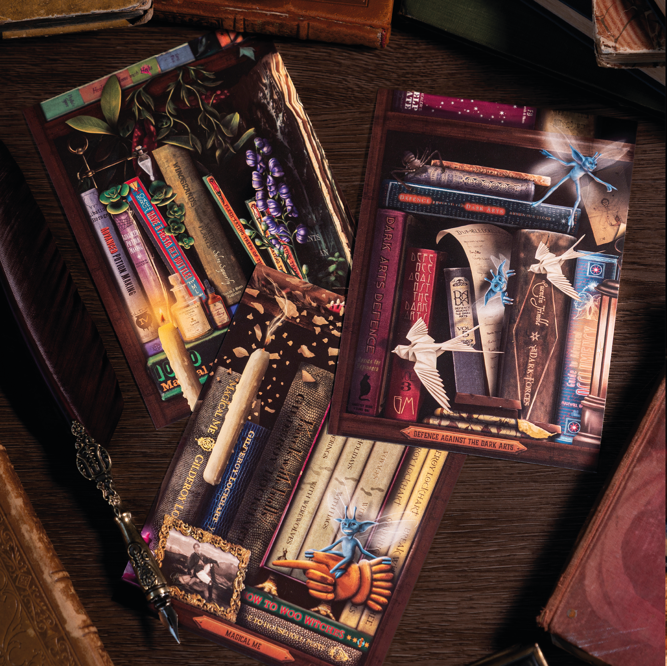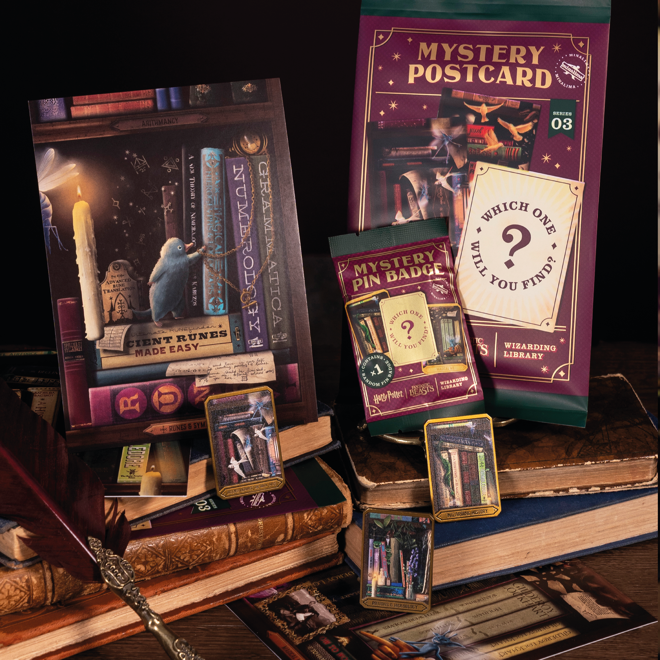 Mystery Postcards S3 – Using designs based off iconic film props, myself and designer Poppy Andruskevicius produced a painterly aesthetic of a fictional shelf based within the Wizarding World. The product consists of eight illustrated postcards that, when lined up, form a larger, continuous illustration of a wizard’s library from the Harry Potter film series. The postcard illustrations were then developed for metallic pin badges. The design is packed with easter eggs from all the films, encouraging customers to collect the full set and uncover hidden details.