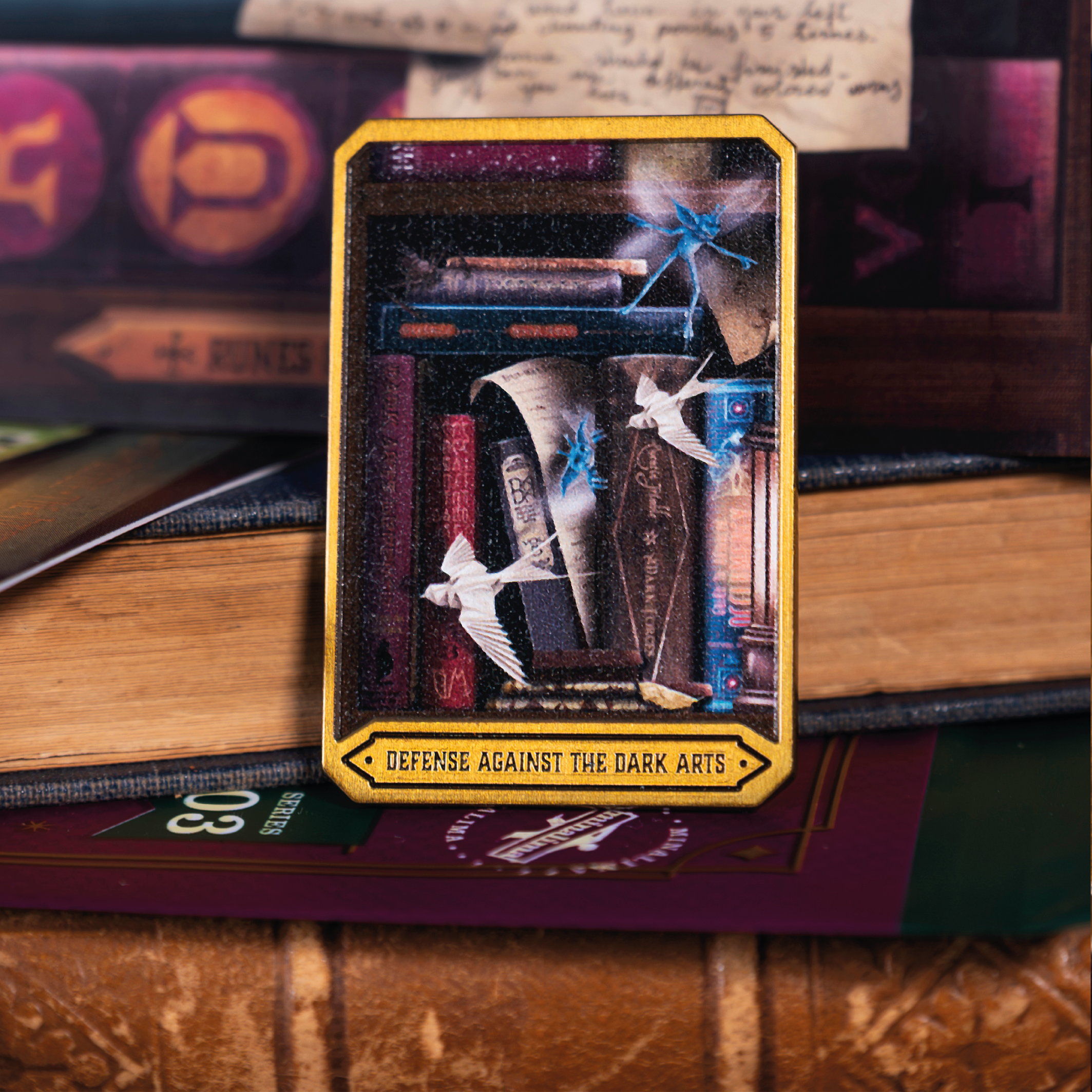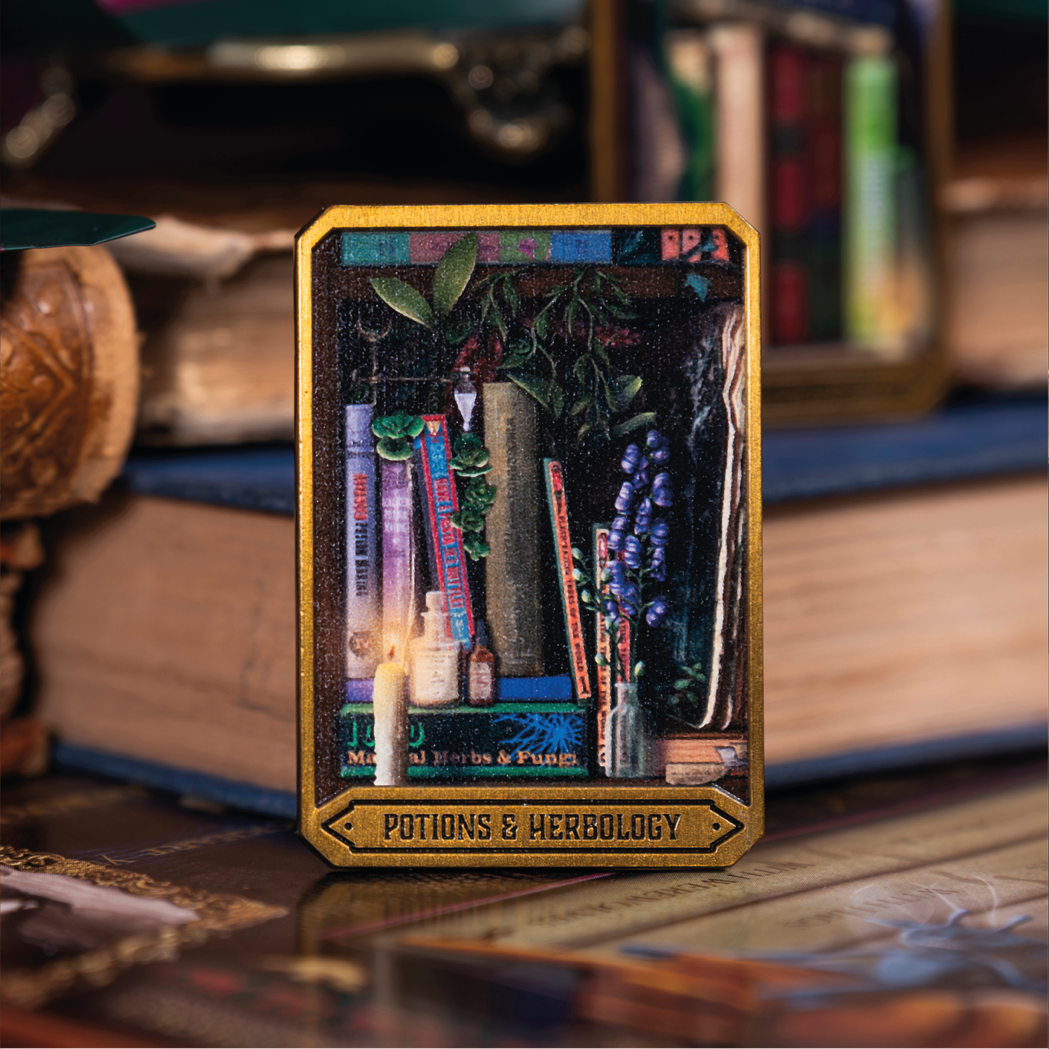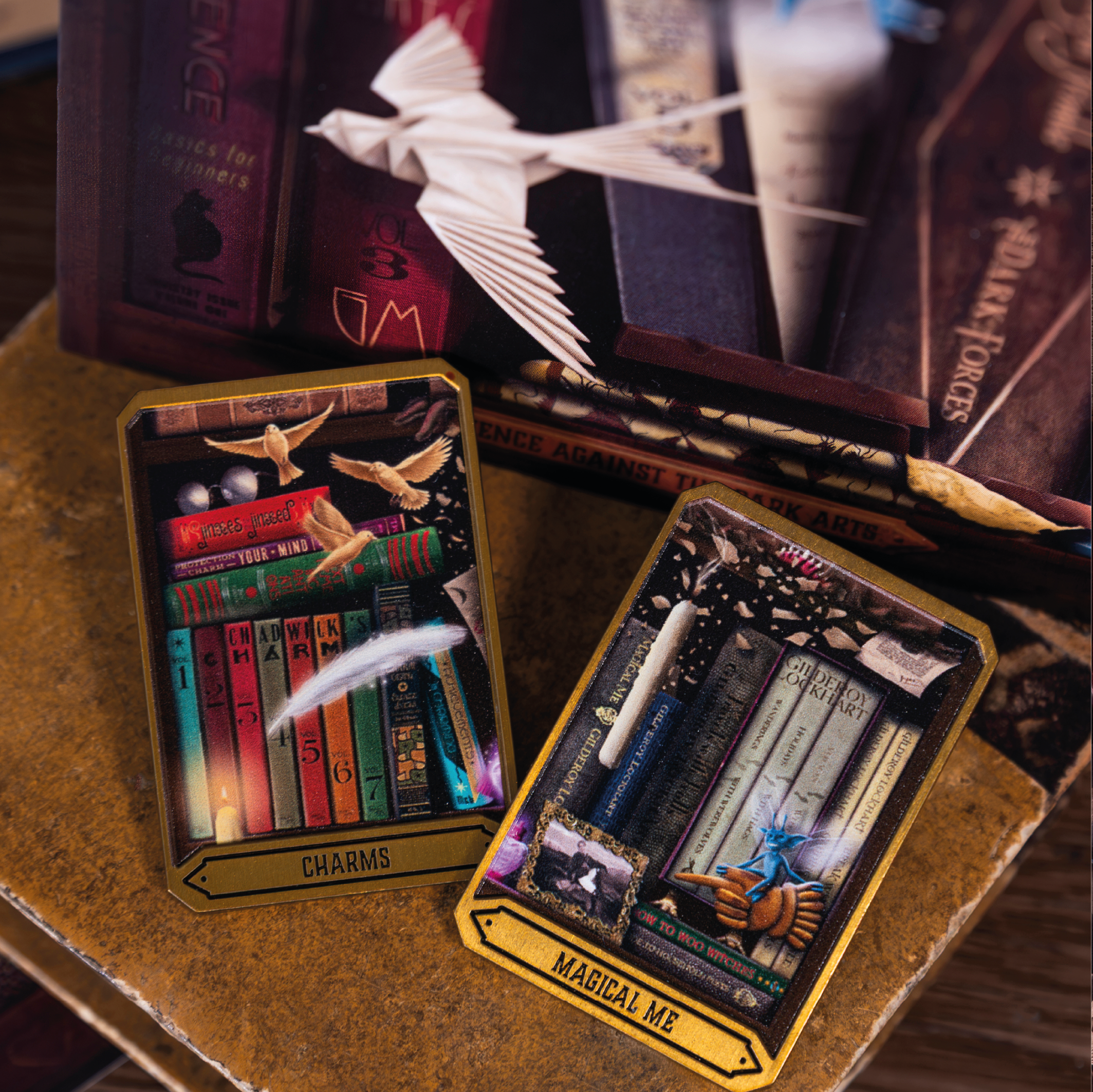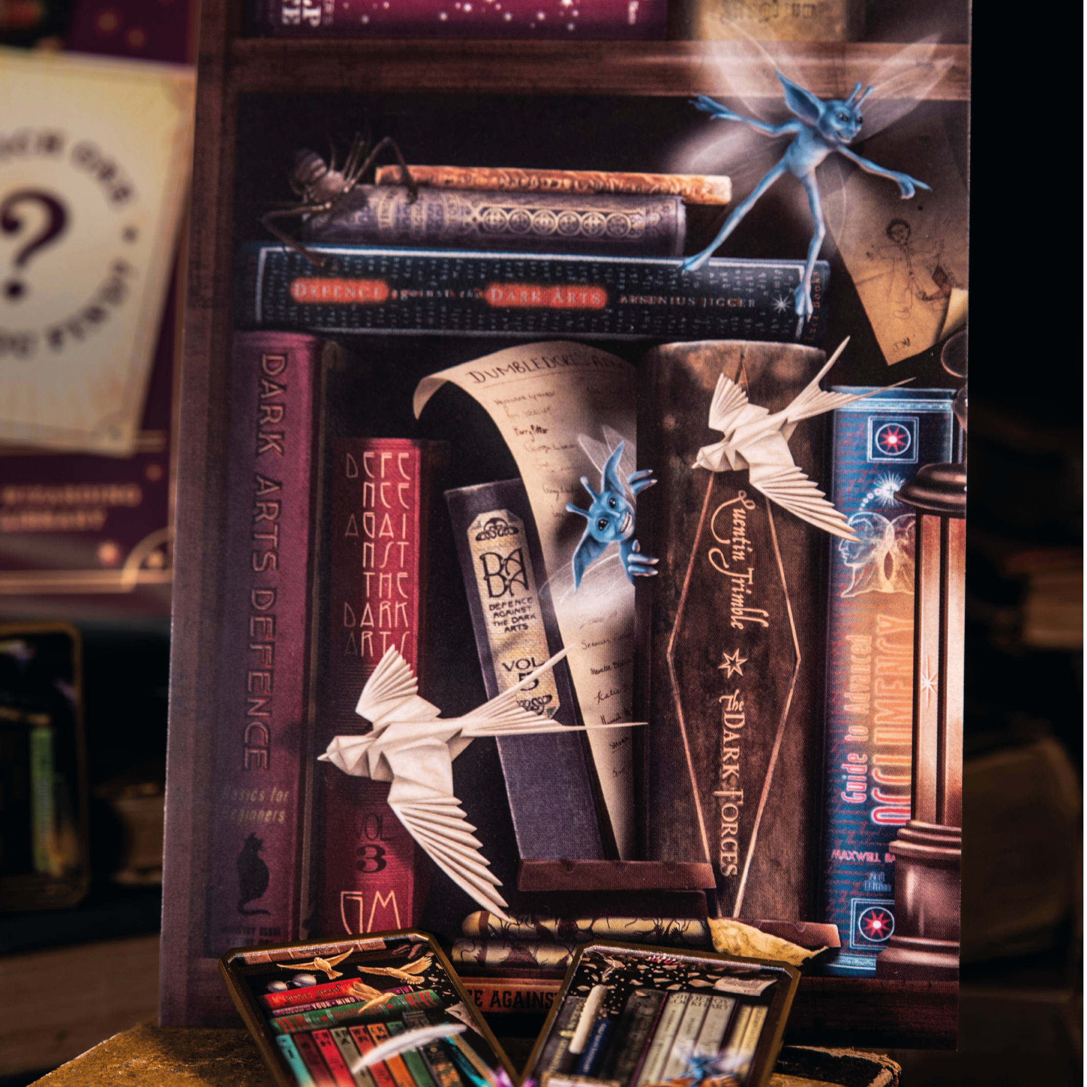 Mystery Postcards S3 – Using designs based off iconic film props, myself and designer Poppy Andruskevicius produced a painterly aesthetic of a fictional shelf based within the Wizarding World. The product consists of eight illustrated postcards that, when lined up, form a larger, continuous illustration of a wizard’s library from the Harry Potter film series. The postcard illustrations were then developed for metallic pin badges. The design is packed with easter eggs from all the films, encouraging customers to collect the full set and uncover hidden details.