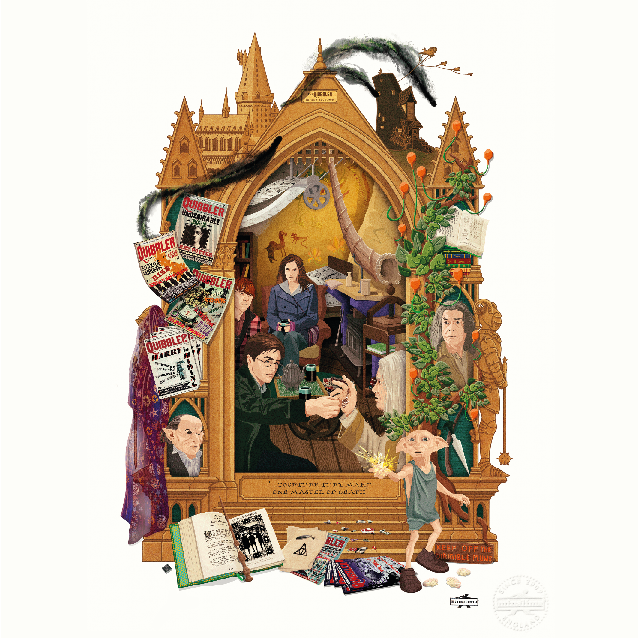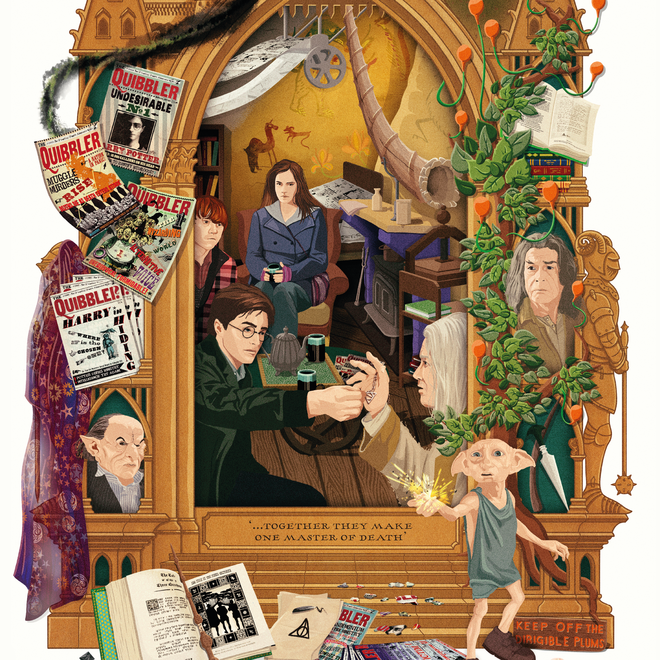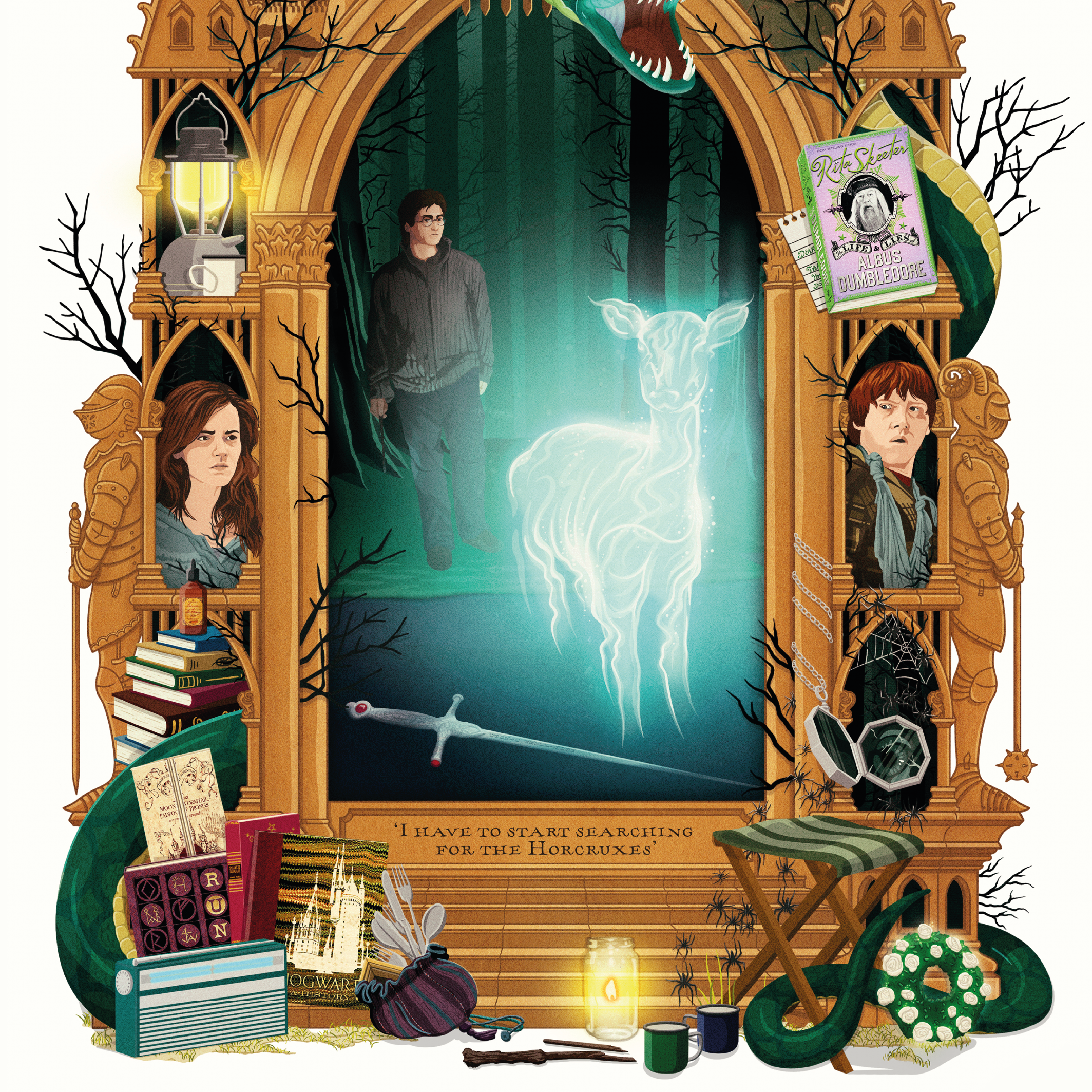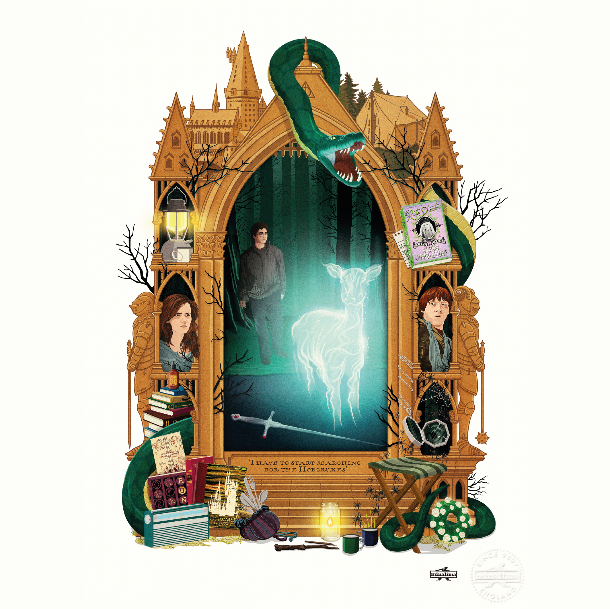Mystery Postcards S3 – Using designs based off iconic film props, myself and designer Poppy Andruskevicius produced a painterly aesthetic of a fictional shelf based within the Wizarding World. The product consists of eight illustrated postcards that, when lined up, form a larger, continuous illustration of a wizard’s library from the Harry Potter film series. The postcard illustrations were then developed for metallic pin badges. The design is packed with easter eggs from all the films, encouraging customers to collect the full set and uncover hidden details.